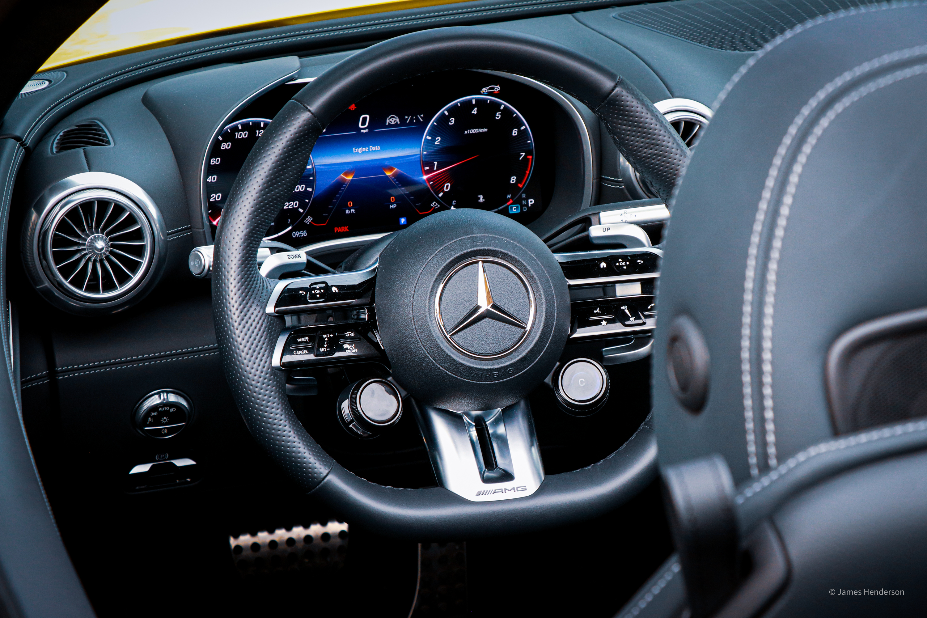 Most of the controls and switchgear are seamlessly incorporated into the four lateral spokes of the AMG Performance steering wheel with its haptic touch sensors. The left upper spoke controls the instrument cluster displays and the right controls the media displays. The lower spokes control the cruise control and telephone hands free system. The AMG Performance Wheel also includes two very clever round touch screens conveniently located by the drivers thumbs to scroll between Comfort, Sports, Sports+, Race and Individual settings on the right and a plethora of other adjustments on the left. The column includes the switchgear for the AMG SPEEDSHIFT MCT 9G transmission, which can also be shifted via the aluminum paddle. Other than the window and seat buttons on the doors, everything else is neatly incorporated into the huge touchscreen on the center console. Mercedes call this integration of analogue geometry and the digital world ‘hyperanalogue’.