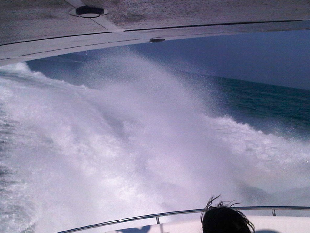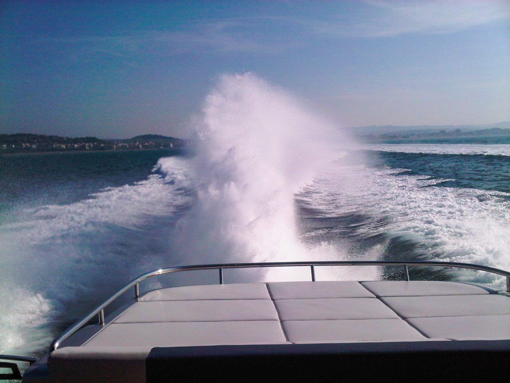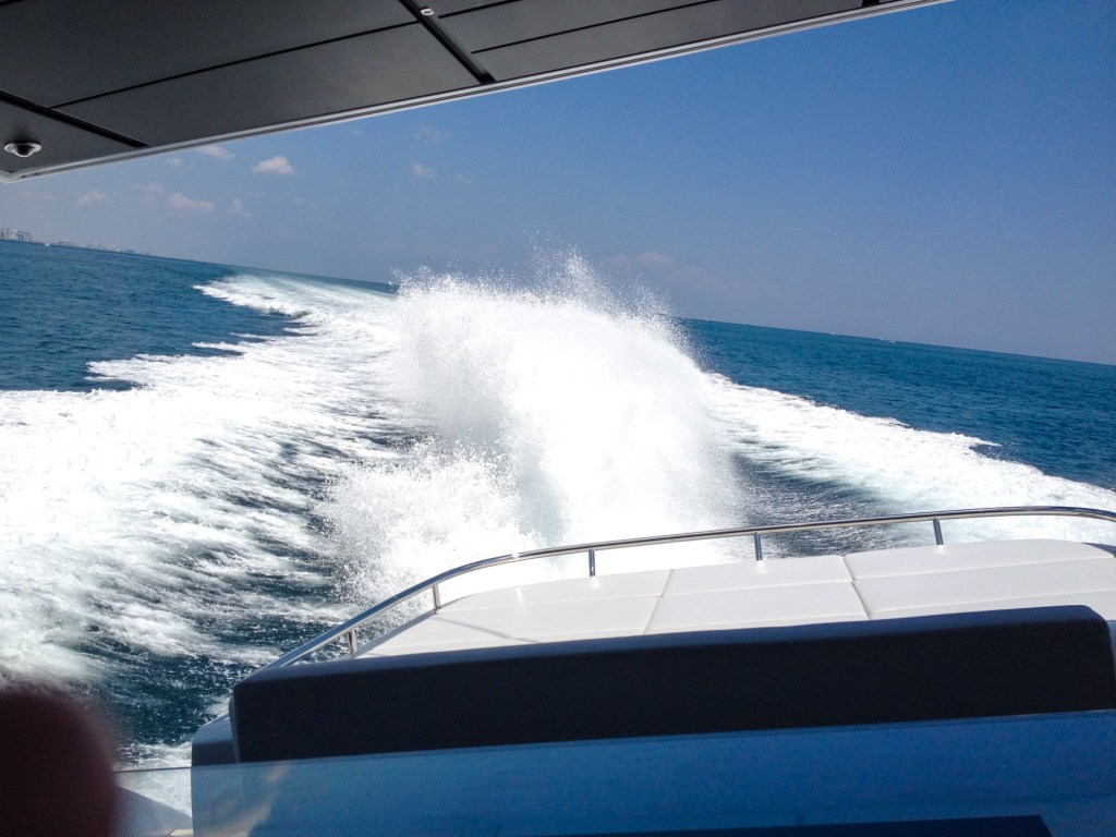 The design of the drives, which can adjust the drives and propellors vertically as well as horizontally, also allows the ‘pilot’ – a more suitable term than captain – to maximise positioning for the optimal propulsion. The drives are also used to turn the boat which enables the Pershings to carve incredibly tight turns and add to maneuverability at speed. At slow speeds and without a conventional rudder, the Pershing surface drive yachts can be slightly more challenging to master, particularly at low speeds and the props also extend well aft of the hull. You can always tell a surface drive when a Pershing us underway by the magnificent rooster tail of water sprayed up behind the boat.