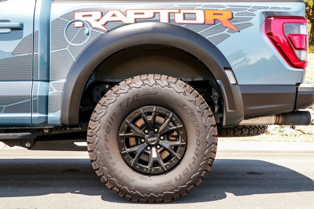The suspension has also been optimized to provide exceptional stability while tackling desert terrain at high speed. The five-link rear suspension is equipped with extra-long trailing arms a Panhard rod and coil springs. The Raptor has Fox Live Valve shocks, which are electronically controlled dampers that use suspension height sensors and adjust to the terrain conditions hundreds of times a second, balancing the ride quality and control both on and off-road. The R spec includes as standard the 37 Performance package, which features the 37-inch BFGoodrich All-Terrain KO2 tires and, with wheel travel of 13 inches at the front and 14.1 in the rear, it provides the Raptor with outstanding capabilities to traverse rocky terrain.