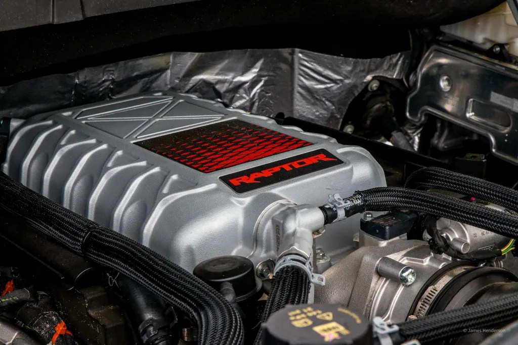 In designing the Raptor R, Ford engineers used the most powerful engine available in the Ford line-up which is the same unit used in the Mustang Shelby GT500 and optimized it for off-road use and durability. The supercharger has been recalibrated with a new pulley system to adapt to off-road use and increase torque delivery at the low-end and mid-range. The exhaust manifolds have been upgraded to a cast stainless design and unique oil cooler and filter, with deeper oil pan has been added to enable the Raptor to take on more aggressive and steeper grades. The air intake volume has also been increased by 66% with a wider air intake inlet and higher flow filters. The end result is that the Raptor R is produces the highest torque from a supercharged V8 in a production pick-up truck.